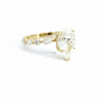 Stunning 14K yellow gold engagement ring featuring a 2.57CTW pear-cut center diamond. Elegantly adorned with marquise and round diamonds for a timeless sparkle that captivates. Perfect for a memorable proposal.